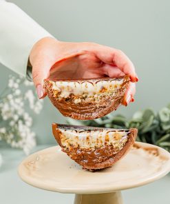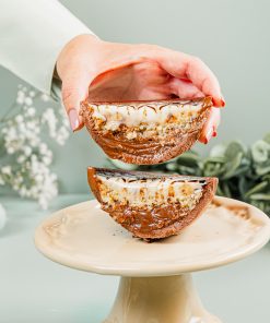 Casca ao leite, super recheada com o nosso tradicional creme de brigadeiro, creme suíço com flocos de chocolate meio amargo e pão-de-ló de baunilha.