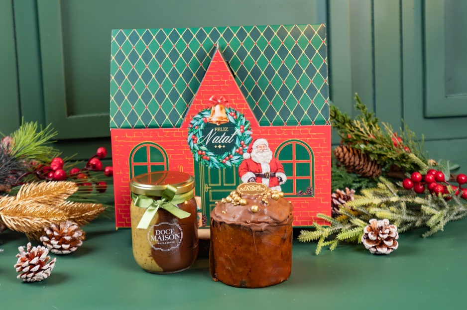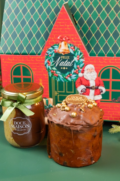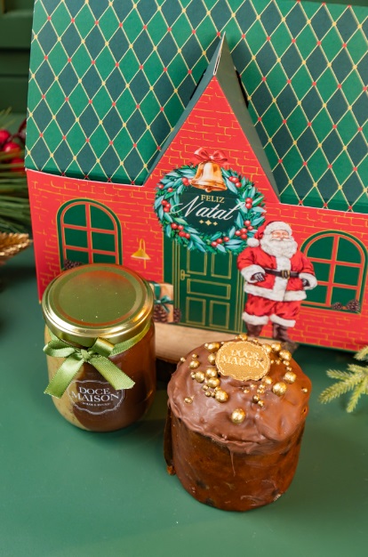 Chocotone artesanal 130g coberto com chocolate nobre, dose da felicidade de pistache e brigadeiro 280g.