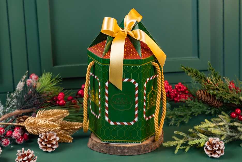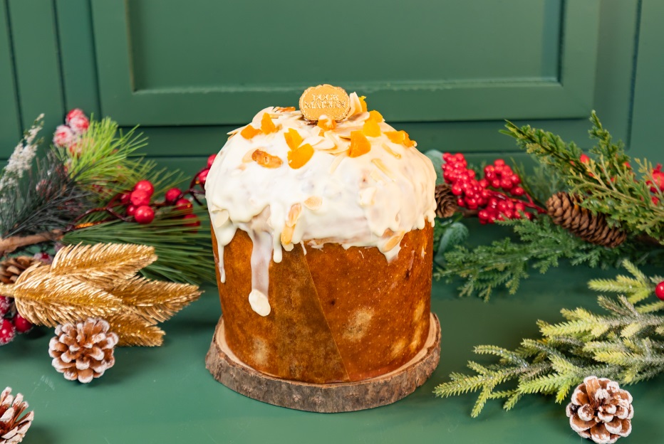 Panetone de frutas cristalizadas 600g com cobertura de chocolate branco damasco e amêndoas.
