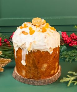 Panetone de frutas cristalizadas 600g com cobertura de chocolate branco damasco e amêndoas.