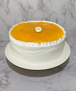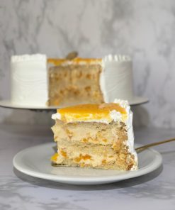 - Massa branca (pão de ló), recheio de creme suíço com damasco.